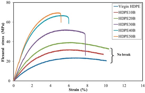 Flexural test: stress–strain behavior of HDPE/birch wood composites.