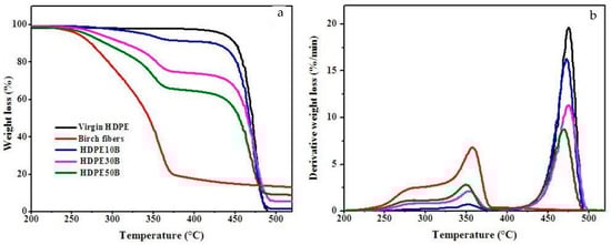 Figure 5 illustrates the thermal stability of virgin HDPE and birch fiber composites between 50 °C and 600 °C.