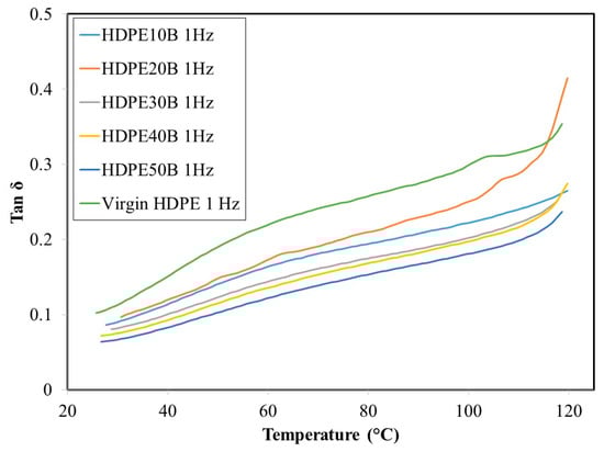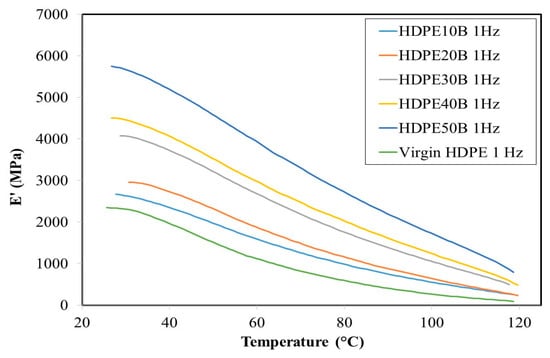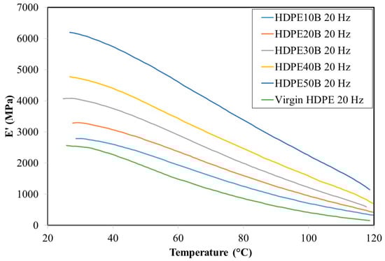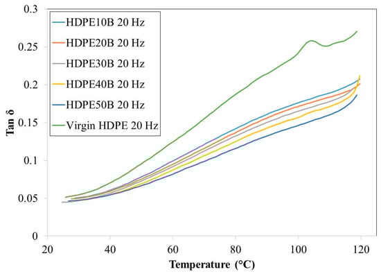 DMA results showed the viscoelastic properties of the resin and the composites. As shown in Figure 6 and Figure 7, the storage modulus decreases as a function of temperature and regardless of the fiber content, at both 1 Hz and 20 Hz frequencies of stress loading. The material thus loses its strength as it is heated, which is attributable to the easing of movement of polymer chain segments as the surrounding thermal energy increases. This property of wood fiber plastic composites has been noted previously by several authors [54,55]. At both frequencies, the storage modulus increases significantly as a function of fiber content, thus confirming the reinforcing role of the fiber. The 61% storage modulus increase from 2300 MPa (virgin HDPE) to 5900 MPa (HDPE50B) at 30 °C, 1 Hz on addition of fibers is due to the increase in stiffness of composites compared to the resin. Finally, although the storage modulus appears to have increased slightly when the frequency increased from 1 Hz to 20 Hz, this effect was not significant.