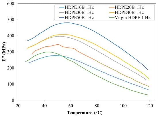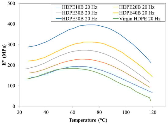 Figure 8 and Figure 9 show that the loss modulus E” increases, reaches a maximum and then decreases as a function of temperature, regardless of the fiber content and at 1 Hz and 20 Hz. This behavior was observed previously in HDPE reinforced with wood fiber [56].