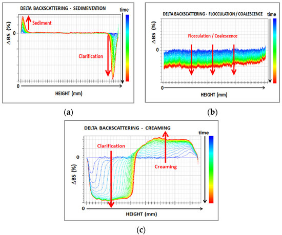 The film-forming dispersions were characterized by Turbiscan (developed by Formulation, Smart Scientific Analysis) at 60 °C for 8 h. The Turbiscan equipment is based on multiple light scattering to identify the particles’ migration and their size change in liquid dispersions. It is provided with two detectors, working in transmission (T) and backscattering (BS) modes. This makes possible the analysis of both transparent and opaque samples. When T is higher than 0.2% the instrument works in transmission mode, whereas a value of T lower than 0.2% indicates backscattering mode. The “Delta” mode facilitates the visualization of destabilization phenomena, by using the first scan as a reference and by amplifying variations. Results were compared with reference ΔBS profiles in the whole cell shown in Figure 1 and adapted from the instrument handbook.