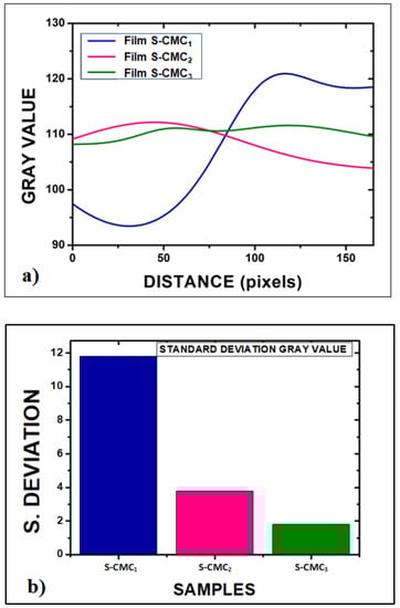 Quantitative assessment of the inhomogeneity degree of films: (a) Plot of the average of each sample profile function, after the optical image conversion into grayscale images by ImageJ software; (b) standard deviation of grey values related to inhomogeneity of films (11.8 for S-CMC1; 3.8 for S-CMC2; and 1.8 for S-CMC3).