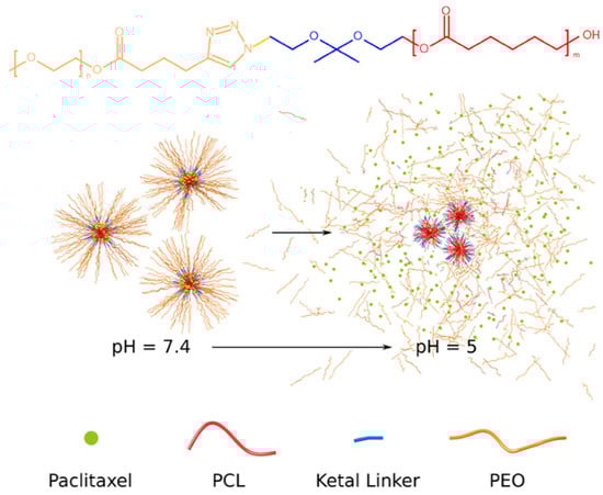 Considering the high acidity in tumor tissues and intracellular compartments, several polymers responsive to pH-sensitive hydrolysis, enzymatic degradation, and/or redox reactions could be suitable for triggering drug release undergoing degradation to various extents in vitro and/or in vivo, acid-labile groups. Such acid-labile linkers, can be hydrazone [25], orthoester [26,27], imine [28], ketal, or acetal [29,30], which have often been used as a responsive group to construct pH-responsive (co)polymers [31,32]. Among all these mentioned above, acid-degradable (co)polymers that contain ketal/acetal labile linkers on the polymer backbone or as pendant groups enabling drug attachment and these NPs have received great interest due to their special features [33,34].