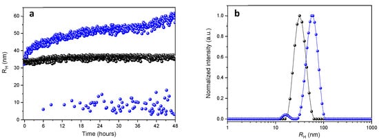 The DLS data from NPs measurements over 48 h at pH ~7.4 and ~5.0 are depicted in Figure 3. The DLS data clearly demonstrated that the hydrodynamic radius (RH) of NPs remains unchanged at pH ~7.4 for 48 h (black circles, Figure 3a), whereas it continuously increased at pH ~5.0 over the 48 h (blue circles, Figure 3a). Additionally, we also observed the appearance of a scattering population that increased over time, that corresponded to smaller sizes fraction with RH ~2 to 15 nm (blue circles, Figure 3a). A representative average intensity distribution of the NPs after 48 h at pH ~7.4 and ~5.0 are shown in Figure 3b. In contrast to the unimodal average size distribution of the NPs at pH ~7.4 (black circles, Figure 3b), the NPs average size distribution at pH ~5.0 is bimodal and shows two main population of particles with RH ~15 nm and RH ~58 nm (blue circles, Figure 3b), respectively.