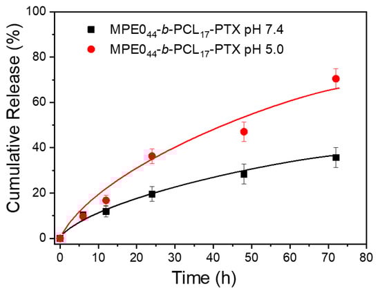 The in vitro release of PTX from the block copolymer NPs was studied in pH-adjusted release media (pH ~7.4 and ~5.0) at 37 °C. Aliquots (500 µL) of drug-loaded block copolymer NPs in PBS were loaded into 36 Slide-A-Lyzer MINI dialysis microtubes with MWCO 10,000 (Pierce, Rockford, IL, USA). These microtubes were dialyzed against 4 L of pH-adjusted PBS buffer gently stirred. The drug release experiments were done in triplicate. At each sampling time, it was removed three microtubes from the dialysis system, and 300 µL from each microtube was sampled and diluted to 1.0 mL by using Acetonitrile (Lach-ner, Czech Republic). The PTX content at each sampling time was then determined via HPLC by applying the same procedure used to determine LC and LE.