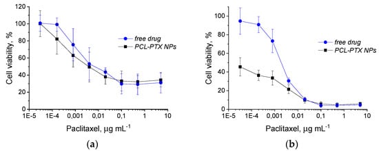Viability of HeLa cells after 24 h (a) and 48 h (b) of incubation with different concentrations of free PTX (blue circles) and PTX-loaded MPEO44-b-PCL17 NPs (black squares).