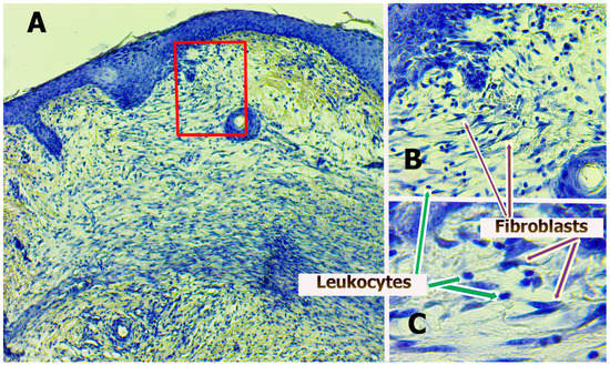 The morphometry and microscopy of wounds were performed after hatching the animals on the 3rd, 7th, and 14th days, as was the preparation of histological sections of wounds, stained according to different methods. For each wound, at least three consecutive sections were made. Hematoxylin–eosin staining was performed for descriptive light microscopy. Staining with hematoxylin alone was carried out for processing sections in the Image-J program (National Institutes of Health, Bethesda, MD, USA) with a quantitative analysis of the number of non-resident cells (cells migrating to the lesion focus, mainly leukocytes that leak from capillaries into the wound) and resident cells (cells that are present and formed in damaged tissues, mainly fibroblasts). Subsequently, during light microscopy, all preparations were divided into three areas of equal length (center of wounds and two edges). On histological preparations, the number of resident (fibroblast) and non-resident (leukocyte) cells was determined by their morphological characteristics in granulation layers in the center and both edges of wounds (Figure 1).
