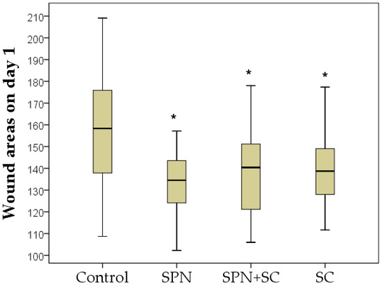 The sizes of the wounds 24 h after their modeling were the largest in the control group. The area of these wounds significantly increased in comparison with day 0 by an average of 1.2 times (p < 0.01). The area of wounds in the remaining groups did not statistically change compared to day 0. As a result, on day 1, statistically significant differences in the wound area of all drug groups compared to the control group were established. The size of wounds in the control group was, on average, 1.17 times greater than in the SPN group (p < 0.01), 1.13 times greater than in the SPN + SC group (p < 0.01), and 1.14 times greater than in the SC group (p < 0.01). The three treatment groups did not differ in this indicator on day 1 of the study (Figure 2).