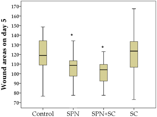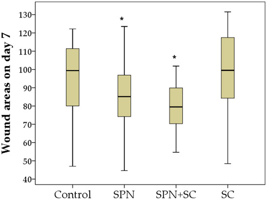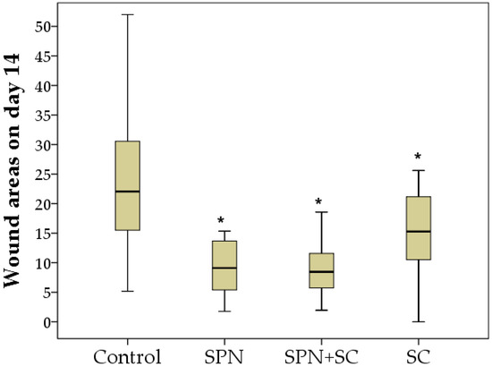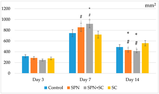 Despite the absence of treatments for all wounds in the second week of the study, statistically significant differences in the wound areas of the control group compared to the other three groups were established by the 14th day, and the best result was achieved in the SPN + SC group. The average wound area in the control group was 22.1 mm2; in the SC group, it was 15.3 mm2; in the SPN group, 9.1 mm2; in the SPN + SC group, 8.5 mm2. On the seventh day, the wound area of the control group was, on average, 2.43 times greater than in the SPN group (p < 0.01), 2.60 times greater than in the SPN + SC group (p < 0.01), and 1.44 times greater than in the SC group (p < 0.05). In addition, it was revealed that the wound areas of the SC group were statistically significantly larger (1.68 times) than the wound areas in the SPN group (p = 0.056) and 1.80 times larger than the wound areas in the SPN + SC group (p < 0.05) (Figure 6).