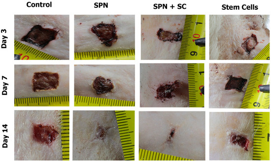 On the third day of the study, the wounds for the treatment in which stem cells were used, in particular SPN + SC, were reduced the most (the area of these wounds significantly decreased on average by 1.25 times relative to day 0, p < 0.01), becoming on average 113.8 mm2. The area of wounds in the SC and SPN groups by the end of the three days decreased by an average of 1.10 times (p < 0.05). The sizes of wounds in the control group were the largest (Me = 132.1 mm2) and did not statistically differ from day 0. The area of wounds in the control group was, on average, 1.07 times larger than in the SPN group (p > 0.05), 1.16 times larger than in the SPN group + SC (p < 0.05), and 1.08 times larger than in the SC group (p < 0.05) (Figure 3). In addition, it was found that the wounds of the SPN group were 1.08 times larger than the wound areas of the SPN + SC group (p < 0.05). This may be due to the addition of the positive therapeutic effects of SPN and SC, which were clinically noticeable by the end of the three days.