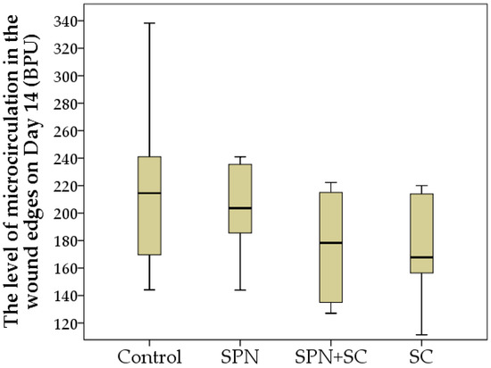On the seventh day, the same tendencies remained, but due to the weakening effect of the cell therapy, differences between the groups in terms of microhemocirculation were absent. On average, this indicator in different groups on day 7 was 158–189 BPU (p > 0.05). By the 14th day of the study, an insignificant tendency for the increased perfusion at the edge of the wounds of the control and SPN groups over the perfusion level of the SC and SPN + SC groups was noted (Figure 9).