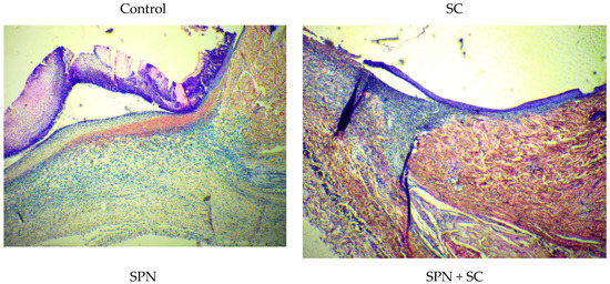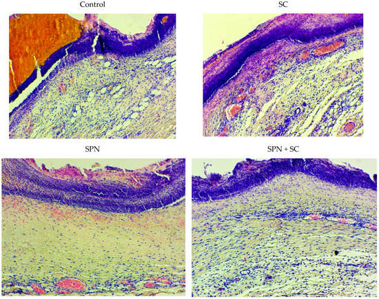 At the same time, the most rapid transition from the phase of exudation to proliferation, which equates to the fastest transition to tissue repair itself, was recorded in the SPN and SPN + SC groups. Histologically, these groups have shown more rapid regeneration, including the epithelialization of the wound surface, as assessed by the length and number of layers of stratified squamous epithelium.