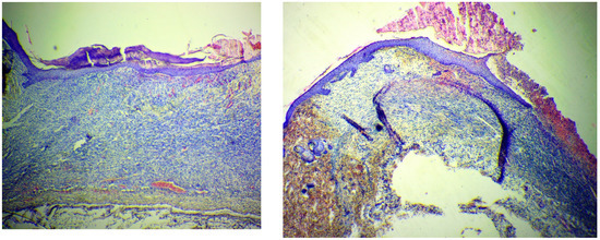 A decrease in leukocyte infiltration in the treatment groups was associated with the most rapid transition from exudation to proliferation. This was confirmed by the following histological signs. First, on day 3, all wounds were covered with a scab, which was soaked in polymorphonuclear leukocytes. The scab was thicker in the control group and thinner in the SC and SPN + SC groups. Second, the leukocyte infiltrates spread widely into the granulation tissue. This was most characteristic of the control group. Thirdly, in the tissues of all wounds, signs of a venous plethora of hypodermis were found, as well as the phenomenon of “marginal pool of leukocytes”. This phenomenon manifested itself in the accumulation of leukocytes in the parietal layer of the blood of postcapillary venules. This indicates the continuation of the migration process of leukocytes into the paravasal tissue, which is typical for the stage of exudation of inflammation. The lowest degree of edema and marginal leukocyte pool was recorded in the SPN + SC group (Figure 10).