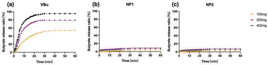 In vitro butyrate release from (a) vinyl butyrate (VBu, 34 mM), (b) NP1 and (c) NP2 (34 mM in butyrate conc.) by pancreatic lipase at 37 °C in 40 mL of 2.5 mM Tris-HCl buffer (pH 7.4) containing 100 mg to 400 mg lipase.