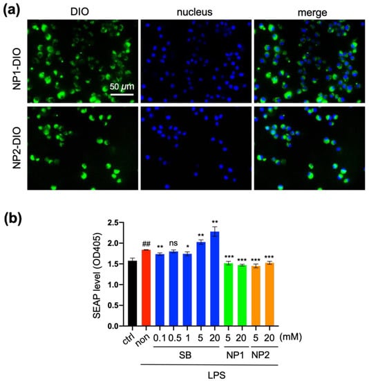 Inhibitory effect of PVBu NPs on NF-κB-mediated macrophage activation. (a) Cellular uptake of NP1-DIO and NP2-DIO by RAW264.7 after 24 h incubation. (b) Suppressive effect of SB, NP1 and NP2 on the inflammatory response of macrophage. RAW264.7 macrophages were treated with SB or PVBu NPs for 6 h, then stimulated by LPS for 18 h. The SEAP level in the supernatant was measured using a substrate. Data are expressed as mean ± S.D (n = 3). ## p < 0.01 vs. control; * p < 0.05, ** p < 0.01, *** p < 0.001 and ns vs. non.