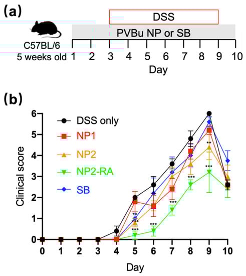 C57BL/6J mice (5-week-old) were fed AIN93G-formula diet (Oriental Yeast, Tokyo, Japan). Mice were treated with drinking water containing NP1 or NP2 (94 mM in butyrate conc.), NP2-RA (94 mM in butyrate conc., 1.6 μg/mL in ATRA conc.), or SB (94 mM) for 10 days. The mice were treated with 2% wt/v DSS in drinking water from day 3 to day 9. Daily changes in clinical scores were measured to monitor the colitis progression. A daily clinical score assessment was conducted according to the stool consistency and colonic hemorrhage [26].