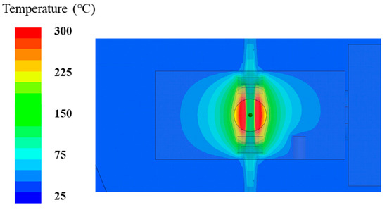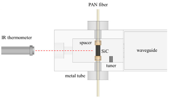 The microwave susceptor, made from silicon carbide (SiC), was a hollow tube of ϕ 3.5 mm × 16.5 mm connected to the metal tubes at the two ends through the ceramic spacers. The susceptor was employed for absorbing microwave energy and forming a uniform thermal field by its high dielectric loss and thermal conductivity. Figure 3 shows the simulation results of the thermal field. The thermal distribution existed in the region of the susceptor only. It was thermally insulated by the ceramic spacers at the two ends. Therefore, we defined the length of the susceptor as the processing region of the pre-oxidation and the time it took from one end to the other as the processing time. A window was located at the front side for the temperature measurement by an IR (infrared) thermometer. The IR thermometer pointed to the middle of the susceptor and measured its surface temperature as the processing temperature.