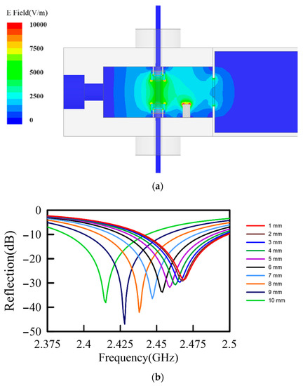 The simulation results of the TM-mode resonant cavity. (a) The distribution of E-field at microwave power of 20 W. (b) The frequency response of the cavity varied with the height of the tuner from 1 mm to 10 mm.