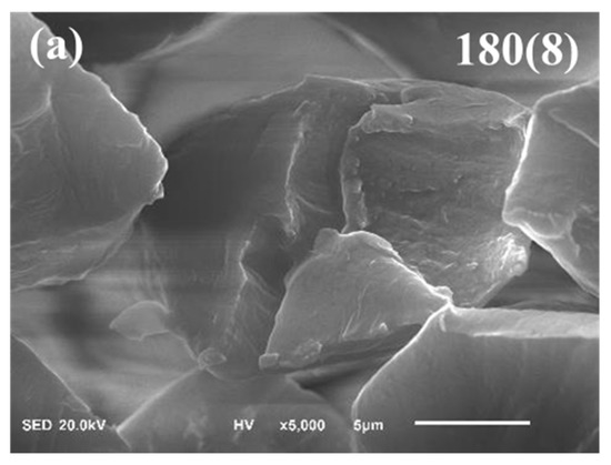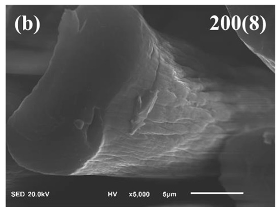 Traditionally, the pre-oxidation of PAN fiber initiates at around 200 °C and is gradually accomplished with the rise in the processing temperature. The pre-oxidized specimens were measured by SEM and XRD. Then the values of the aromatic index were estimated to characterize the degree of the pre-oxidation. A lane of PAN fiber of 12 K filaments which was provided by Jinggong Technology went through the microwave annealing system under different processing conditions (temperature and time). The specimen’s name indicates the processing conditions. For example, 180(8) denotes that the PAN fiber moves 16.5 mm (the length of susceptor) with the surface temperature at 180 °C for 8 min. The lane of pre-oxidized PAN fiber looked dark and slightly burgundy through irradiation by an intense light source. Figure 4 shows the cross-section area of the pre-oxidized specimens from SEM, which was randomly picked from the lane. In Figure 4a, the cross-section area of specimen 180(8) features an uneven fracture surface, while specimen 200(8) in Figure 4b does not. The XRD results are introduced for a more detailed explanation.