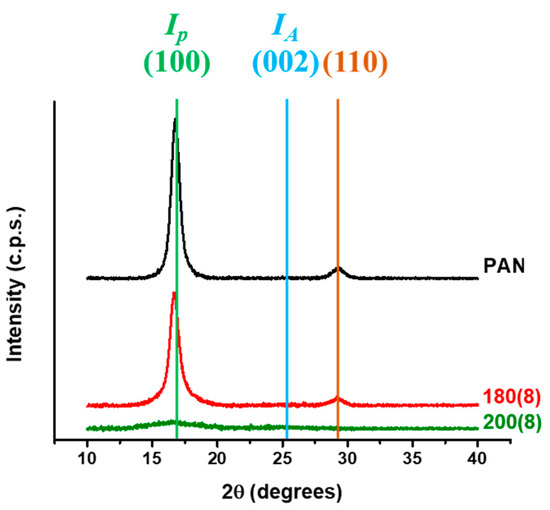 Figure 5 reveals the variance of XRD results for the pre-oxidized specimens. The raw PAN fiber figured two characteristic peaks, one was (100) at 2θ = 17°, and the other was (110) at 2θ = 29°. These peaks implied the chemical structure of the fiber was a chain-shaped texture, and they would gradually diminish during the annealing process. Then they finally turned into a characteristic peak of (002) at 2θ = 25° that implied the formation of a ladder-shaped texture with the completion of the pre-oxidation. Specimen 180(8) indicated the chemical structure was still almost the same as the raw PAN fiber after the annealing process. Since PAN is a kind of thermoplastic chain-shaped polymer, the temperature effect makes it soften and fracture easily by shear force, and results in the uneven fracture surface appearing in Figure 4a. Furthermore, the (100) peak of specimen 200(8) diminished obviously, while the degree of the pre-oxidation was insufficient since the (002) peak was still not revealed.