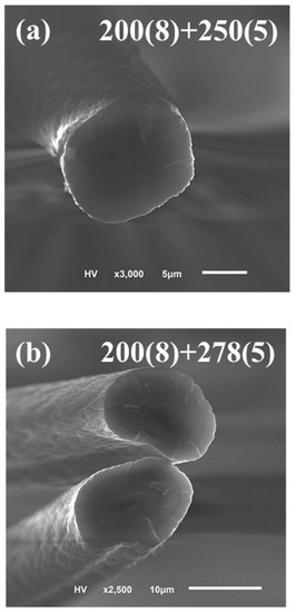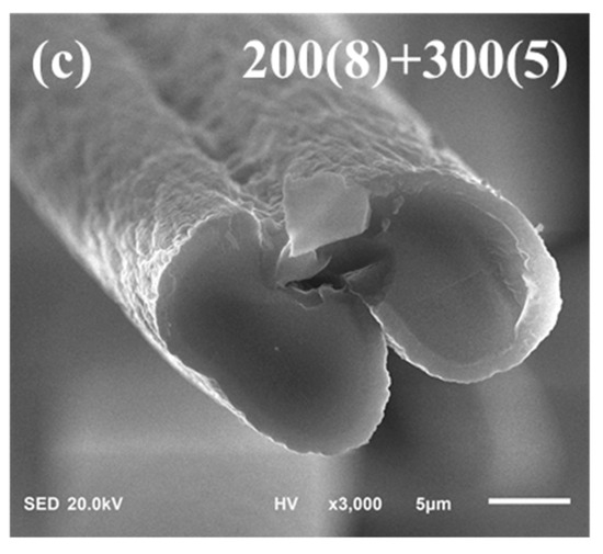This two-step microwave pre-oxidation processing had two purposes: (1) forming a metastable chemical structure for a minimum supporting strength at the first step with a lower temperature over a longer time, and (2) forming a very stable ladder-shaped structure at the second step with a higher temperature in a shorter time. Owing to the XRD results that feature in Figure 5, we defined 200 °C as the first processing temperature and combined with a higher temperature range from 250 to 300 °C as the second. The specimens with the two-step microwave annealing process looked as dark as the commercially available carbon fiber no matter whether the second-step processing temperature was 250 °C or 300 °C. It was difficult to tell these pre-oxidized specimens with the naked eye. Figure 6 exhibits the cross-section view of the two-step pre-oxidized specimens by SEM. In Figure 6a, the cross-section view of specimen 200(8) + 250(5) looked much smoother, and the microwave process left a uniform annealing effect without a sheath-core structure, while in Figure 6b,c, damage appeared at the edge of specimens 200(8) + 278(5) and became severe for the case of specimens 200(8) + 300(5). We found that the microwave-heated specimens were easily burned out at 325 °C and higher for the second-step pre-oxidation processing temperatures. Figure 6 shows that the actual surface morphology of the PAN fibers was also destroyed and stuck to each other even when the specimens were just heated at 278 °C and 300 °C. Therefore, we considered this damage as a kind of thermal fusion and that the polymer melted under the unexpected annealing temperature.