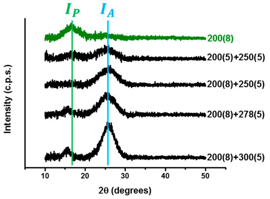 Compared with Figure 5, the XRD results in Figure 7 demonstrate that the characteristic peak of (200) at 2θ = 25° was revealed after the two-step microwave annealing process. The higher the processing temperature at the seconds step, the better the crystallization of (200). Besides, the processing time at the first step would slightly affect the result. Using a shorter processing time, i.e., 5 min. would produce worse crystallization. The aromatic index of each specimen can be estimated from the XRD results and expressed as: