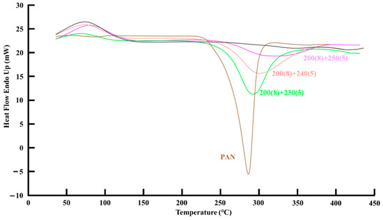 The DSC spectrum exhibited a coherent result as XRD. Figure 8 shows the DSC results for the two-step microwave pre-oxidation process. The area integration of exothermic peak (exothermic heat, ΔH) for each processing condition can be compared to the exothermic heat of raw PAN fiber and estimate the degree of aromatic reaction. It explores a trend that the exothermic peak gradually becomes weaker and broader when raising the processing temperature of the second-step annealing. The aromatic index from the DSC results can be estimated as follows: