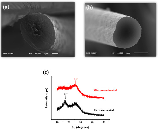 Comparison of furnace-heated and microwave-heated pre-oxidation specimens. (a) The cross-section area of the furnace-heated specimen. (b) The cross-section area of the microwave-heated specimen. (c) The XRD result reveals that the furnace-heated specimen still has a residual part of linear polymer structure.