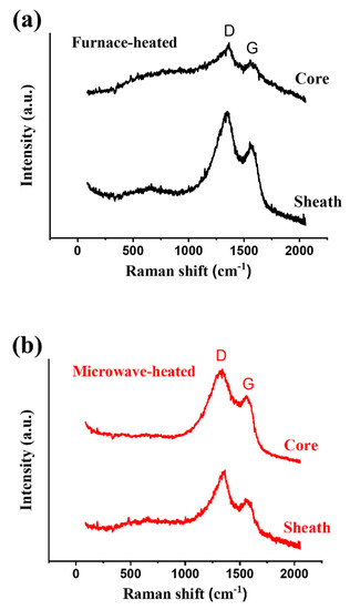 The Raman spectra of (a) furnace-heated and (b) microwave-heated specimens.