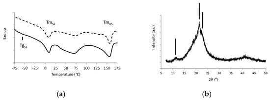 Differential scanning calorimetry (DSC) analysis was performed with a TA Instruments Q200 (Waters Corporation, Milford, MA, USA) apparatus under helium atmosphere at a scanning rate of 10 °C/min from −80 °C to 180 °C. Two scans were successively recorded with intermediate cooling at 10 °C/min. The uncertainty on the characteristic transition temperatures was ±1 °C, and the uncertainty on the enthalpy values was 5%.