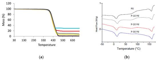 (a) TGA curves of the nanocomposites (P0: black; P-5 Pd: yellow; P-10 Pd: grey; P-20 PD: red, P-30 Pd: blue); (b) DSC heating scan of the nanocomposites (shifted curves—exo up).
