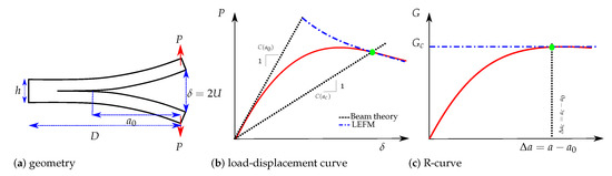 The double cantilever beam (DCB) test shown in Figure 1a and used in this work is the most widely used procedure for the measurement of mode I delamination fracture toughness. For the load-displacement curve (see Figure 1b) and considering a rigid foundation at the crack ending, the compliance can be given by the beam theory as C ( a 0 ) = 2 a 0 3 / 3 E I , where I = B h 3 / 12 and E is the Young’s module. A corrected compliance taking into account an elastic foundation is presented in [19]. Finally, the relation linking P and δ during the propagation phase can be obtained from Equation (1). Further details can be found in [20].