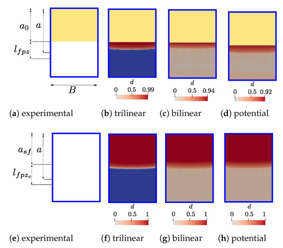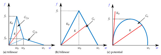 In this work, a bilinear [71,72], a trilinear [38,73] and a potential model [40] are studied, which are schematized in Figure 3. In all these laws, the fracture energy G c corresponds to the area under the curve. However, the energy is decomposed into two parts ( G c = G f μ + G f b ) for the trilinear CZM, which has been attributed to micro-cracking ( G f μ ) and fiber-bridging ( G f b ) [73]. For each model, damage d is written in terms of the displacement jump w and the parameters to be identified, as summarized in Table 3.