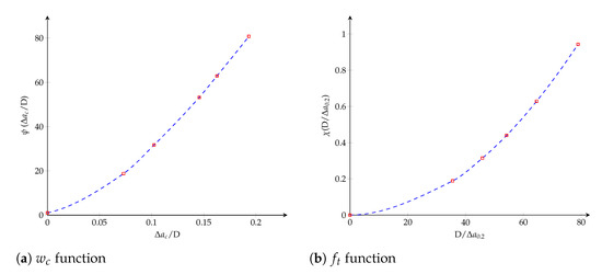 From Figure 11b it is assumed that K 0 does not have influence on the critical crack extension Δ a c , then the third argument disappears. Besides, the relation f t = 2 G c / w c enables going without having the second variable w c / w c h = 0.5 , then multiplying by 1 / D and considering Equation (4):