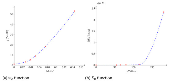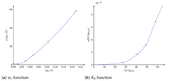 Figure 17. Potential cohesive model. The dimensionless functions for model parameters as a function of the crack length: (a) w c function; (b) K 0 function.