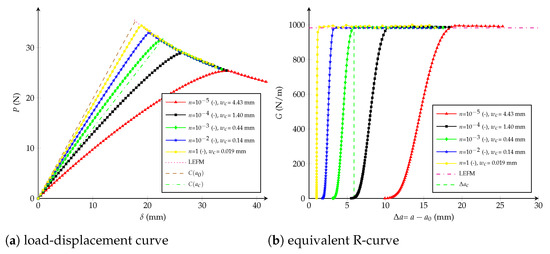 Figure 14. Potential cohesive model: (a) load-displacement curve; (b) equivalent R-curve. Influence of the parameter n with K 0 = 1 · 10 13 N/m 3 as constant.