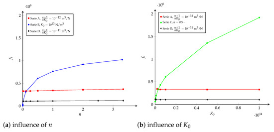 Figure 15. Potential cohesive model. Influence of (a) n and (b) K 0 on f t (more details in Table A1).