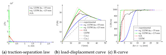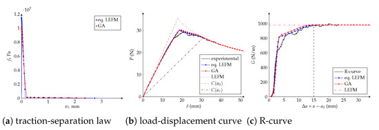 As explained in Section 1, the equivalent LEFM R-curve enables representing the influence of the FPZ development on the specimen compliance, through an elastically equivalent crack a (see Figure 2) located at some distance ahead of the initial crack a 0 (or the current stress-free crack a s f ). In [26], a new procedure to identify the parameters of the trilinear cohesive model has been proposed. It is based on the equivalent LEFM R-curve and on a dimensional analysis in order to relate the parameters’ dependency on the geometry and material of the specimen. The main idea is to relate each model parameter with the load-displacement curve and the corresponding equivalent LEFM R-curve through numerical simulations. Among the advantages, this methodology avoids an experimental measure of the critical opening w c and determines the CZM parameters more efficiently than blind fitting or optimization methods such as genetic algorithms, because less numerical evaluations are needed.
