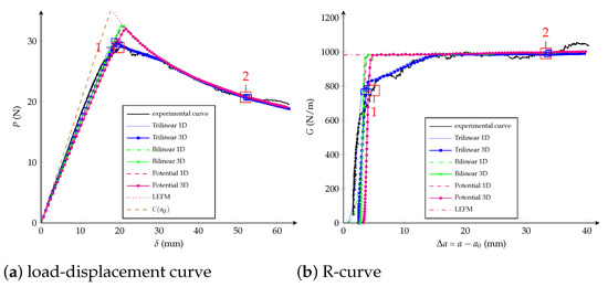 Figure 22. Experimental and numerical DCB tests (3D and 2D simulations): (a) load-displacement curve; (b) R-curve.