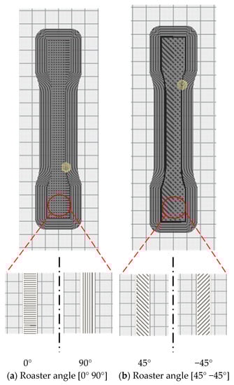 - Fatimatuzahraa, A.W.; Farahaina, B.; Yusoff, W.A.Y. The effect of employing different raster orientations on the mechanical properties and microstructure of Fused Deposition Modeling parts. In Proceedings of the 2011 IEEE Symposium on Business, Engineering and Industrial Applications (ISBEIA), Langkawi, Malaysia, 25–28 September 2011; IEEE: Piscataway, NJ, USA, 2011; pp. 22–27. [Google Scholar]