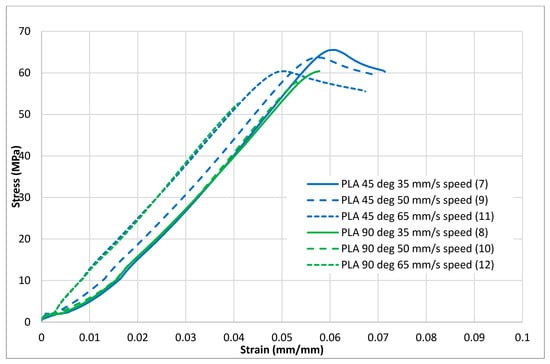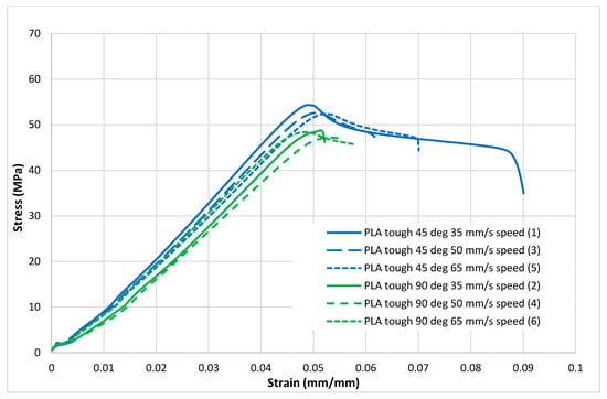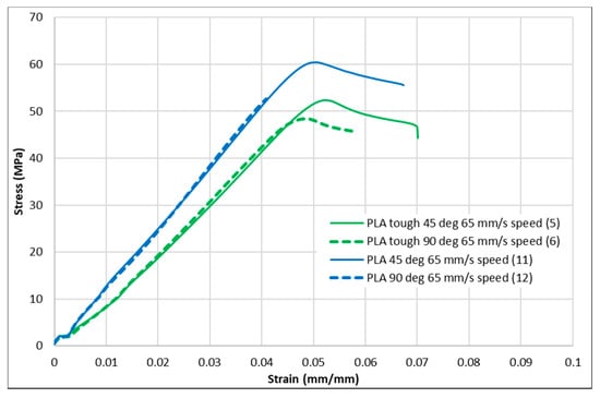 Stress–strain curves for PLA and tough PLA at a 65 mm/s infill speed.