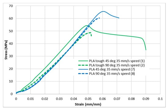 Stress–strain curves for PLA and tough PLA at a 35 mm/s infill speed.