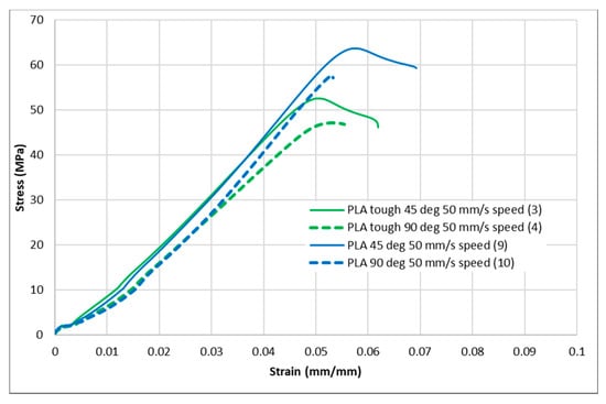 Stress–strain curves for PLA and tough PLA at a 50 mm/s infill speed.