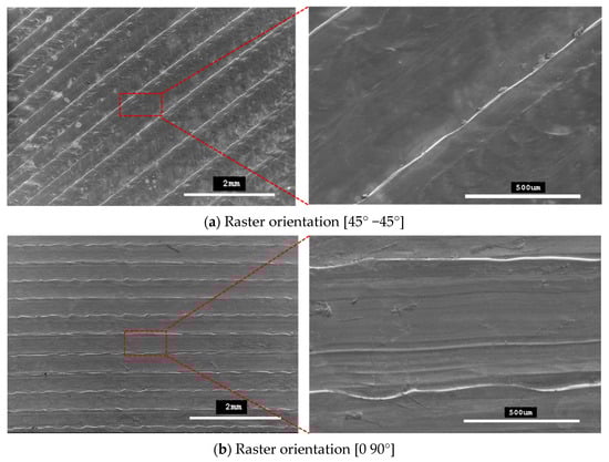 Figure 9 shows SEM micrographs of the outer top surfaces of the tensile specimens. These micrographs confirm that printed patterns formed with 45° −45° and 0 90° raster orientations.
