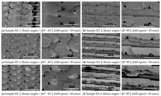 Figure 10 and Figure 11 show SEM micrographs of the fracture interface of the tensile specimens that were fabricated with two raster angles and three different infill speeds using PLA and tough PLA materials, respectively. The specimens that were printed with a raster angle of 45° −45° show the most roughly fractured surfaces compared to the specimens that were printed with a raster angle of 0° 90°. In Figure 10 and Figure 11a,c,e, the specimens that were fabricated with a raster angle of 45° −45° fractured due to material failing during tensile loading; therefore, larger tensile strength and tensile modules were achieved. As shown in Figure 10 and Figure 11b,d,f, the specimens that were fabricated with raster angles of 0° 90° got ruptured along the 0° roaster layers and formed smooth fractured surfaces. The specimens that were fabricated with this raster orientation failed due to breakdown in the interfacial adhesion between two adjacent layers. This raster orientation does not allow effective transfer of the tensile load from one layer to another layer, thereby the specimen does not resist the full tensile load and breaks before the material reaches its tensile strength. Therefore, the specimens that were printed with a raster angle of 45° −45° show better strength and more confine fracture surfaces compared to the specimens that were fabricated with a roaster angle of 0° 90°.