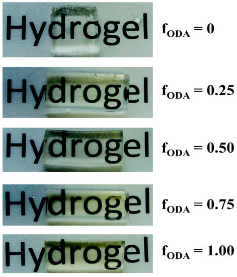 The reaction mixtures containing ODA were initially opaque due to its insolubility in the other monomers, but they became gradually transparent as the reaction proceeded. The resulting networks displayed good clarity, which further increased after equilibration in NaCl 0.1 M (Figure 4).