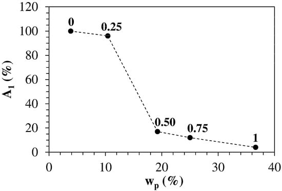 In addition, the variation of the fraction of the smaller crosslink density zones, indicated by A1(%) (see Figure 7), is peculiar as it undergoes an abrupt reduction in the range 10% ≲ wp ≲ 15%, corresponding to 0.25 < fODA < 0.50. This witnesses a sudden and important increase of the hydrogel heterogeneity imputable to the formation of physical crosslinks, induced by hydrophobic interactions, that superimpose to the pre-existing chemical crosslinks. In other words, up to wp = 10% (fODA = 0.25), the crosslink density is essentially of chemical origin while the physical crosslink density becomes more and more important as the network HLB decreases.