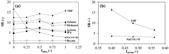 (a) Room temperature swelling ratio in various solvents as a function of fODA (q = 0.80; fJD400 = 0.40). (b) Effect of fJD400 on the room temperature swelling ratio in THF and in NaCl 0.1 M (q = 0.80; fODA = 0.75). Each datum represents the average of four replicates.