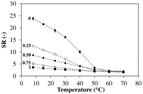 The swelling tests in NaCl 0.1 M were carried out at different temperatures as follows. A strip was cut from a wet specimen and put at 5 °C. After 24 h its mass ms was measured, then the temperature was increased step by step up to 70 °C weighing the strip after 24 h of equilibration at each temperature. Finally, the strip was soaked in distilled water to remove the salt, dried and weighed to determine its dry mass md. The values of SR and wp were evaluated at every temperature using Equations (1) and (2), respectively. All swelling measurements were repeated on four different strips.