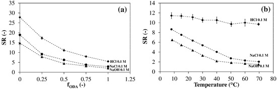 Effect of the pH on the swelling behavior. (a) Dependence of the room temperature swelling ratio from fODA. (b) Swelling ratio vs. temperature for the hydrogel with fODA = 0.50. Each datum represents the average of four replicates.